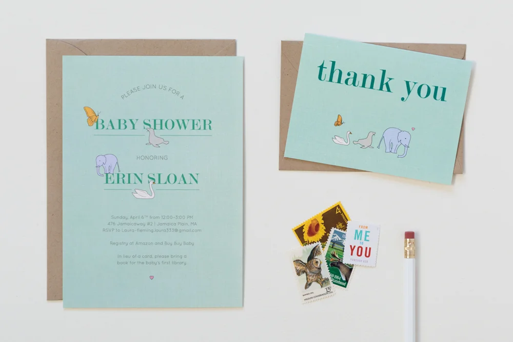A playful and gender-neutral invitation to celebrate the upcoming arrival of Erin’s little one. For this invitation, our customer requested a “design to highlight the first letters in “baby” and “shower”. In addition to the invitation, matching thank you notes and bunting were designed.