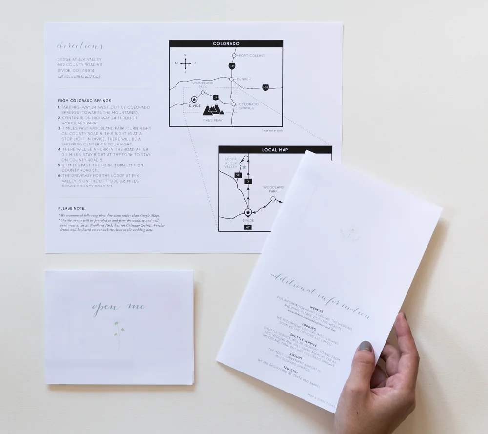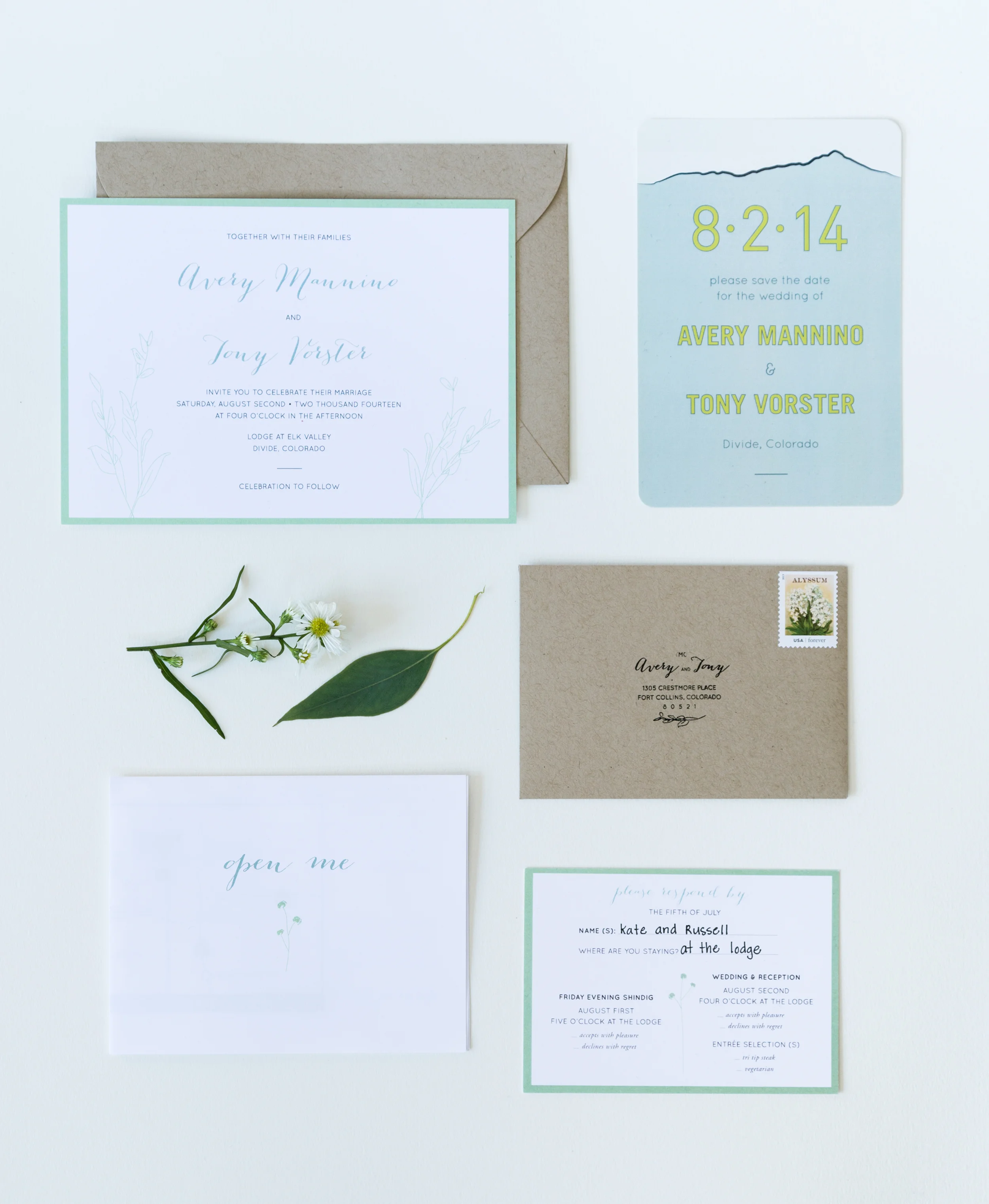 An invitation suite for a summer wedding in Colorado. We incorporated line drawings of Pike’s Peak and floral details to illustrate the abundant nature of this unique location. The additional information and map fold out was designed to be printed on an 8.5” by 11” sheet. The bride hand addressed kraft envelopes and stamped the back flap with a matching return address stamp that we designed. All elements were flat printed and sent to the couple for assembly.