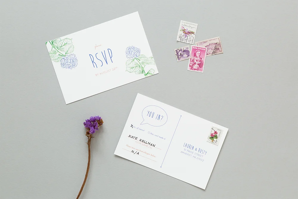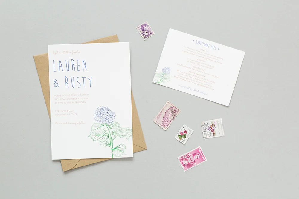 A fresh and fun invitation suite for an outdoor New England wedding. We incorporated purple hydrangeas as an ode to the location in which the couple got engaged. In addition to the main invitation, we designed additional information and rsvp cards. All elements were flat printed and sent to the couple for assembly.